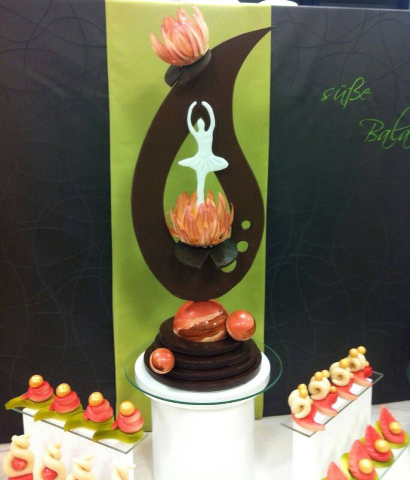 Mit meinem Schaubuffet zum Thema „süße Balance“ konnte ich überzeugen und habe aus Schokolade ein Schaustück kreiert, dass nur auf einer dünnen Kugel aus Schokolade stand.